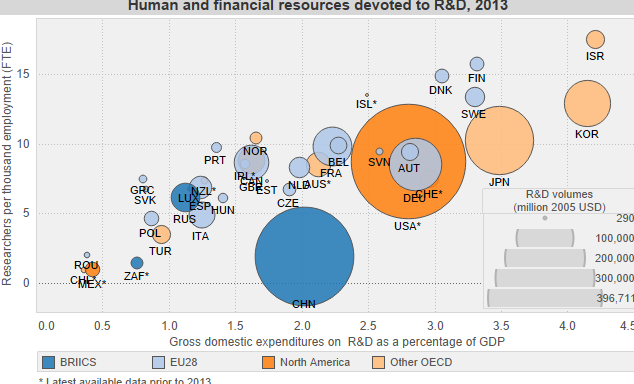 Podiel HDP do výskumu Z pohľadu ľudských a finančných zdrojov v porovnaní podiel HDP, spracované OECD, je veda a výskum v roku 2013 situovaná z geografického hľadiska v krajinách BRIICS, Severná Amerika, Japonsko, Kórea. Načŕta sa otázka, koľko dávajú jednotlivé krajiny do rozvoja vedy a výskumu z podielu HDP. Pokiaľ sa pozrieme na štáty V4, tak česká republika investuje 1,92% z HDP, maďarsko 1,41%, poľsko 0,87% a slovenská republika len 0,83% z HDP investuje na podporu vedy a výskumu. Na druhej strane, je potrebné spomenúť krajiny, ktoré si uvedomujú ako investície do vedy a výskumu dokážu priniesť inovácie, start-upy, patenty. Napríklad Izrael investuje do vedy a výskumu 4,21% z HDP, 4,15% z HDP investuje Kórea, Japonsko 3,47% z HDP, Fínsko 3,31% z HDP, Švédsko 3,3% z HDP, Dánsko 3,06% z HDP, Nemecko 2,85% podľa údajov z OECD, dostupný dáta z roku 2013.